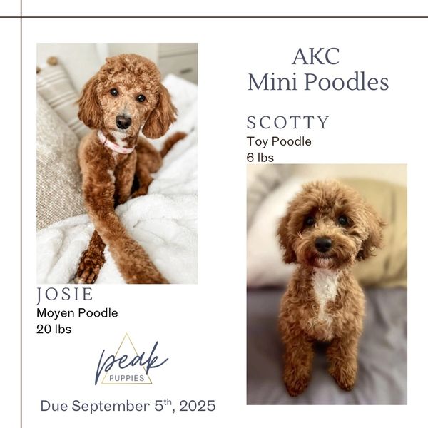 Josie gave birth to five perfect poodles on September 3rd, 2025. She had three boys and two girls. They will be ready to go home on October 29th, 2025.